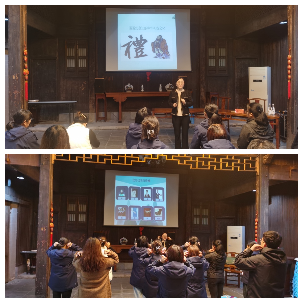 此次培训通过“请进来”的方式,特别邀请黄山学院旅游学院李瑛老师到唐模景区进行授课。培训会上,李瑛老师以“中华礼仪文化”开篇,通过PPT讲解、案例分析、互动交流、场景模拟等多种形式,围绕规范的站姿、坐姿、走姿和引领方式等内容对服务礼仪进行重点讲解,并结合规范礼仪展示和具体分解动作进行现场实操培训。寓教于乐的互动式教学让此次培训充溢着激情与欢乐,大家在高涨的学习氛围中积极地与老师互动交流,并在互学共进中更直观的发现自身不足,进一步优化礼仪动作,提升形象素质。