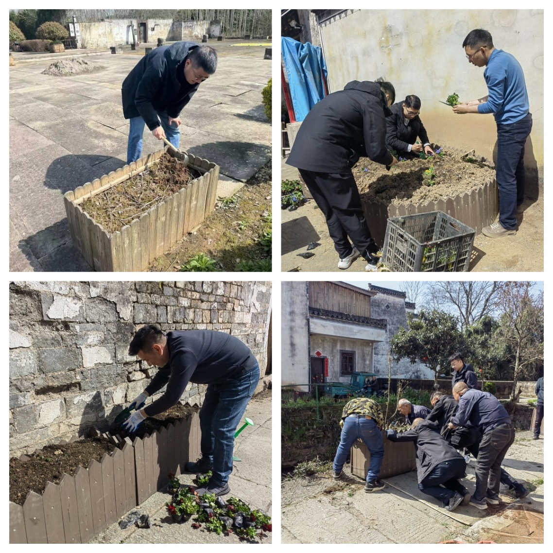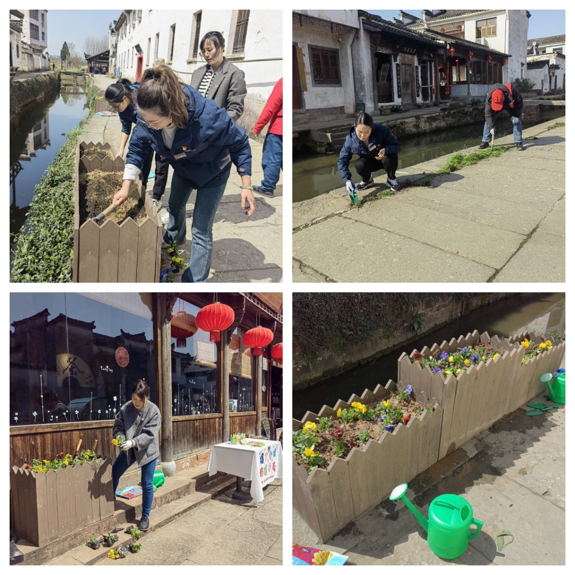 在景区内水街沿线,大家相互配合、有序分工,以饱满的热情投入到活动中。清除杂草、搬运花箱、翻松旧土、花卉栽种、提壶浇水,来回穿梭,井井有条,整个活动呈现出一派热火朝天的忙碌景象。经过一上午的努力,一棵棵花苗在景区花箱内“安家落户”,目之所及星星点点的小花和徽派建筑相映成画,真正做到了“远处有景、近处有花”。栽种结束后,党支部党员们对花箱进行认领,纷纷表示将落实落细日常养护责任,确保所认领的花箱有人养、有人清,让每个花箱都有“专属管家”。